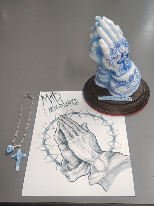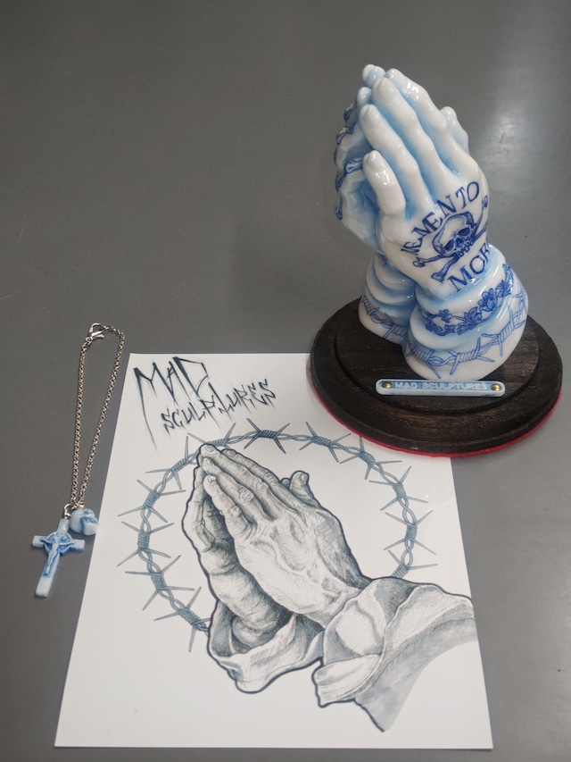 ホワイトのポリウレタン樹脂にペンドローイングを施し、ウレタンクリヤーコーティングで陶器風に仕上げたプレイングハンドです。スカルとクロスのミニチャームとL2サイズの限定イラストが付属します。 1点物の為、同じ作品はありません。 ハンドメイド作品の為、細かい気泡等や個体差があります。ご了承ください。