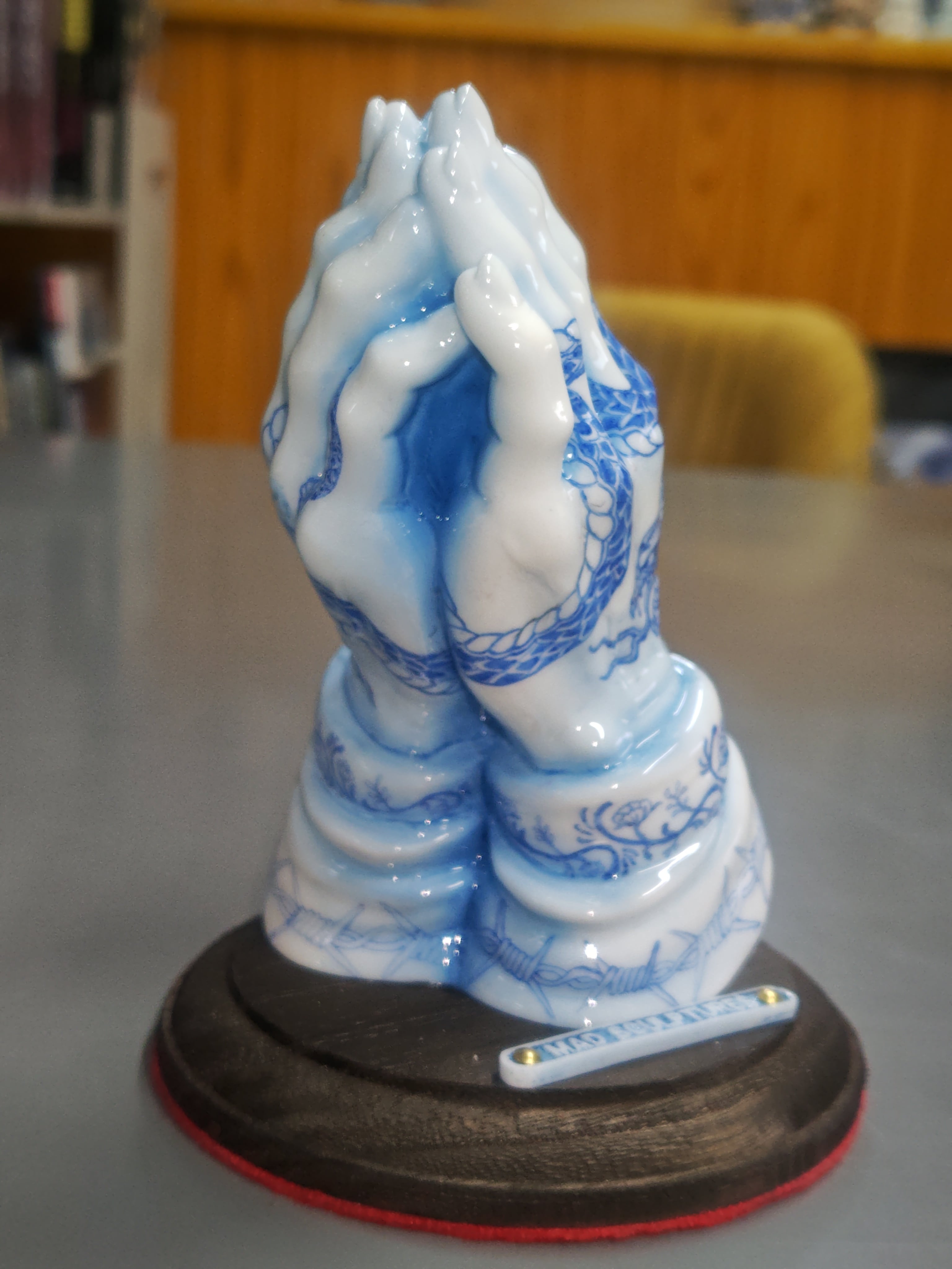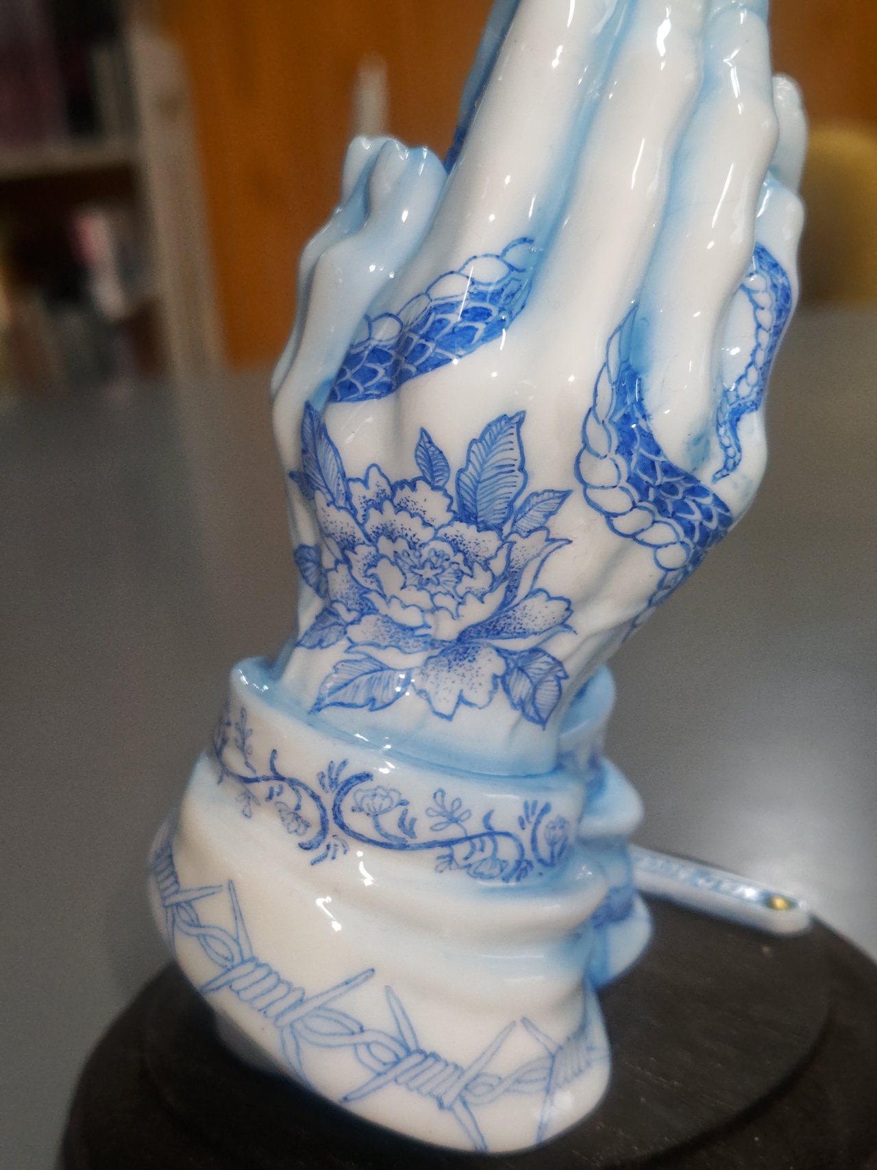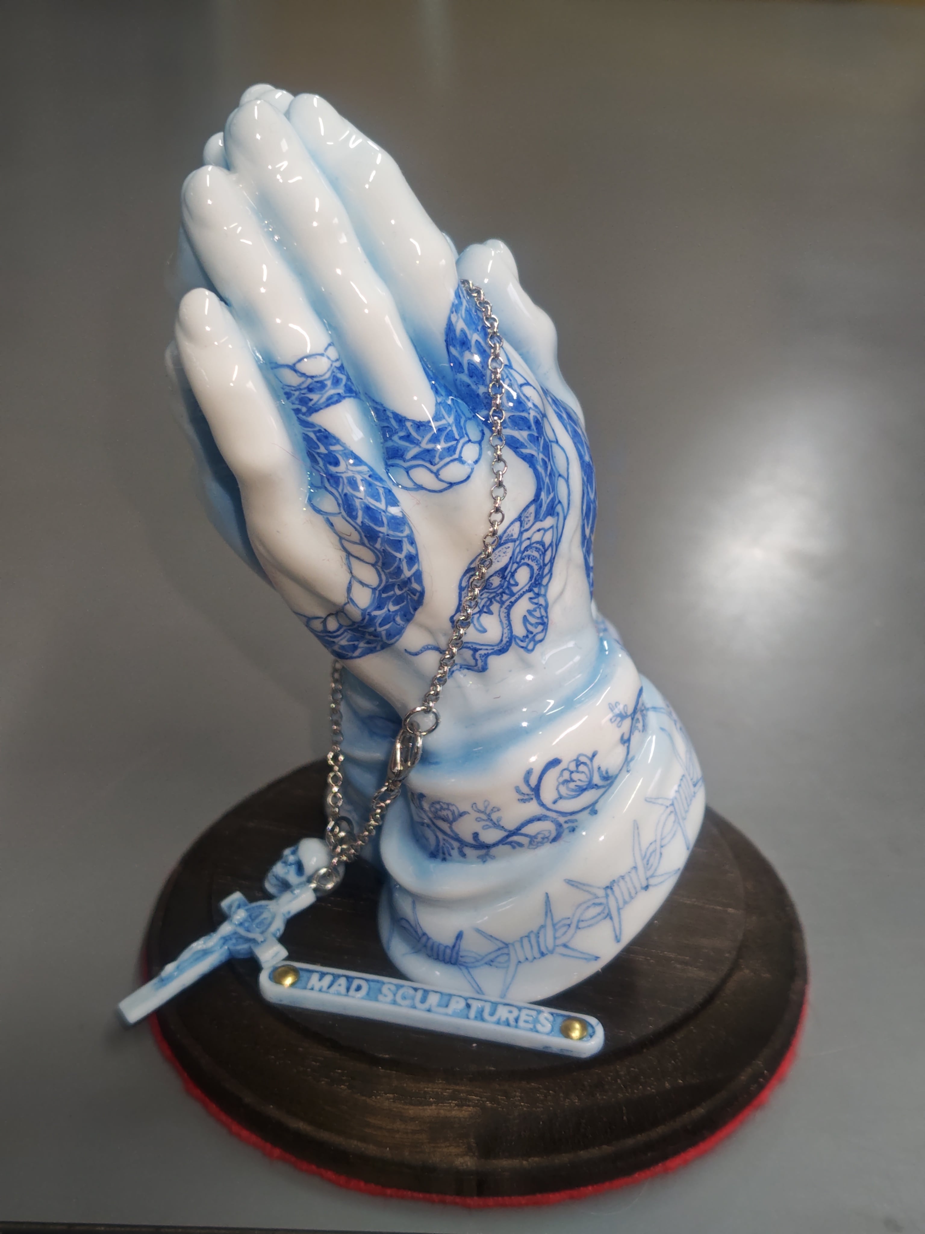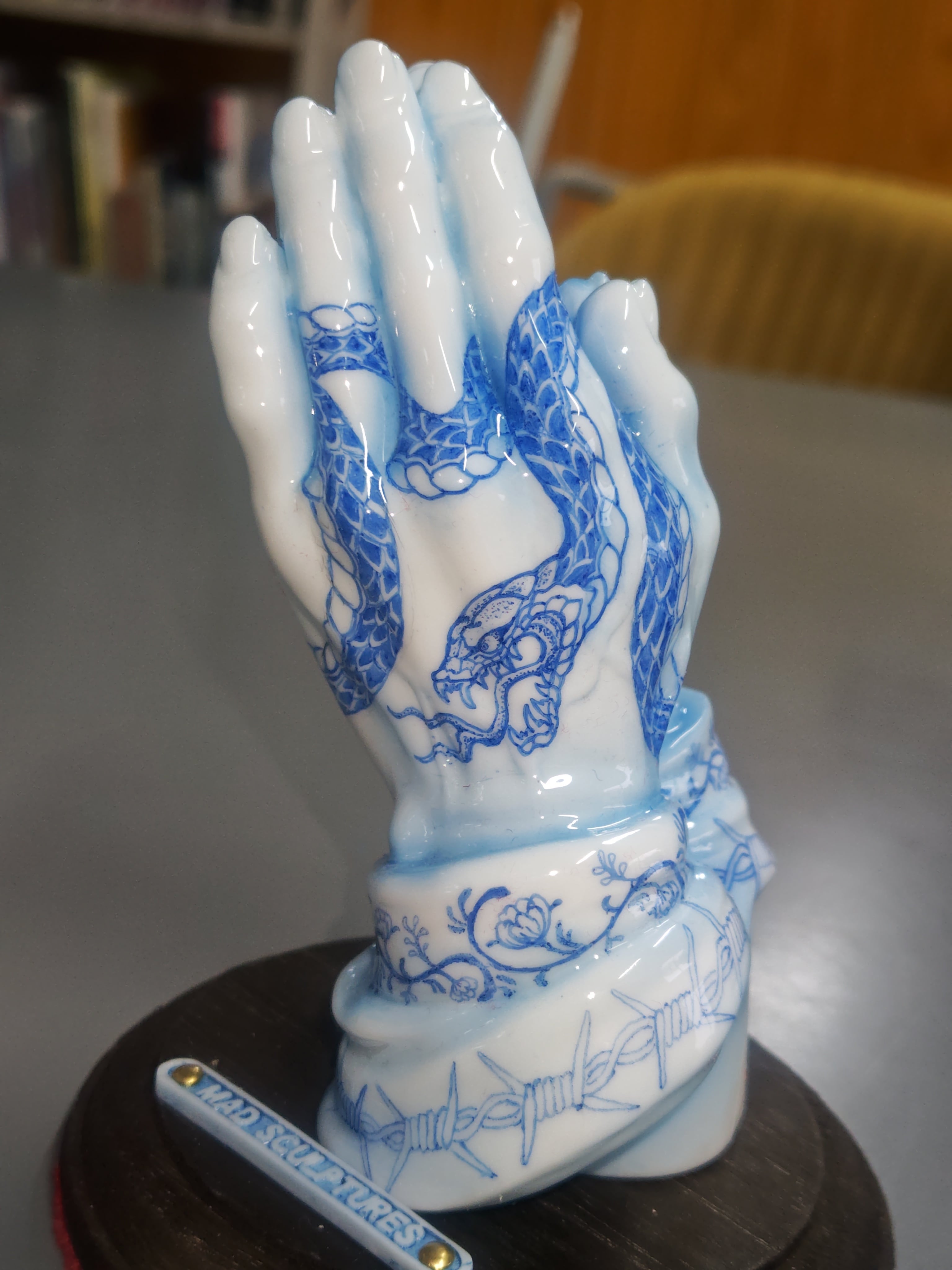 ホワイトのポリウレタン樹脂にペンドローイングを施し、ウレタンクリヤーコーティングで陶器風の質感を表現した作品です。