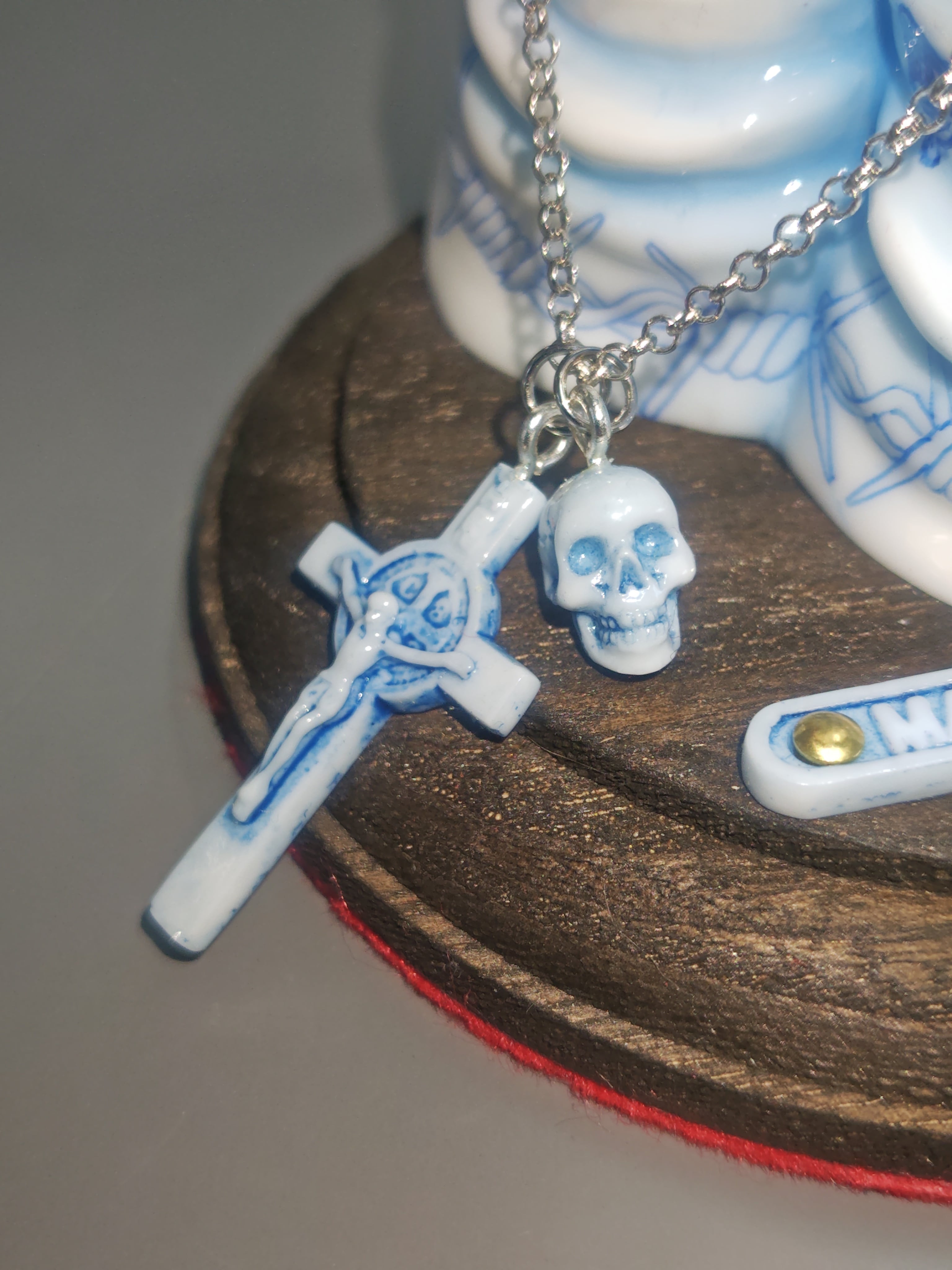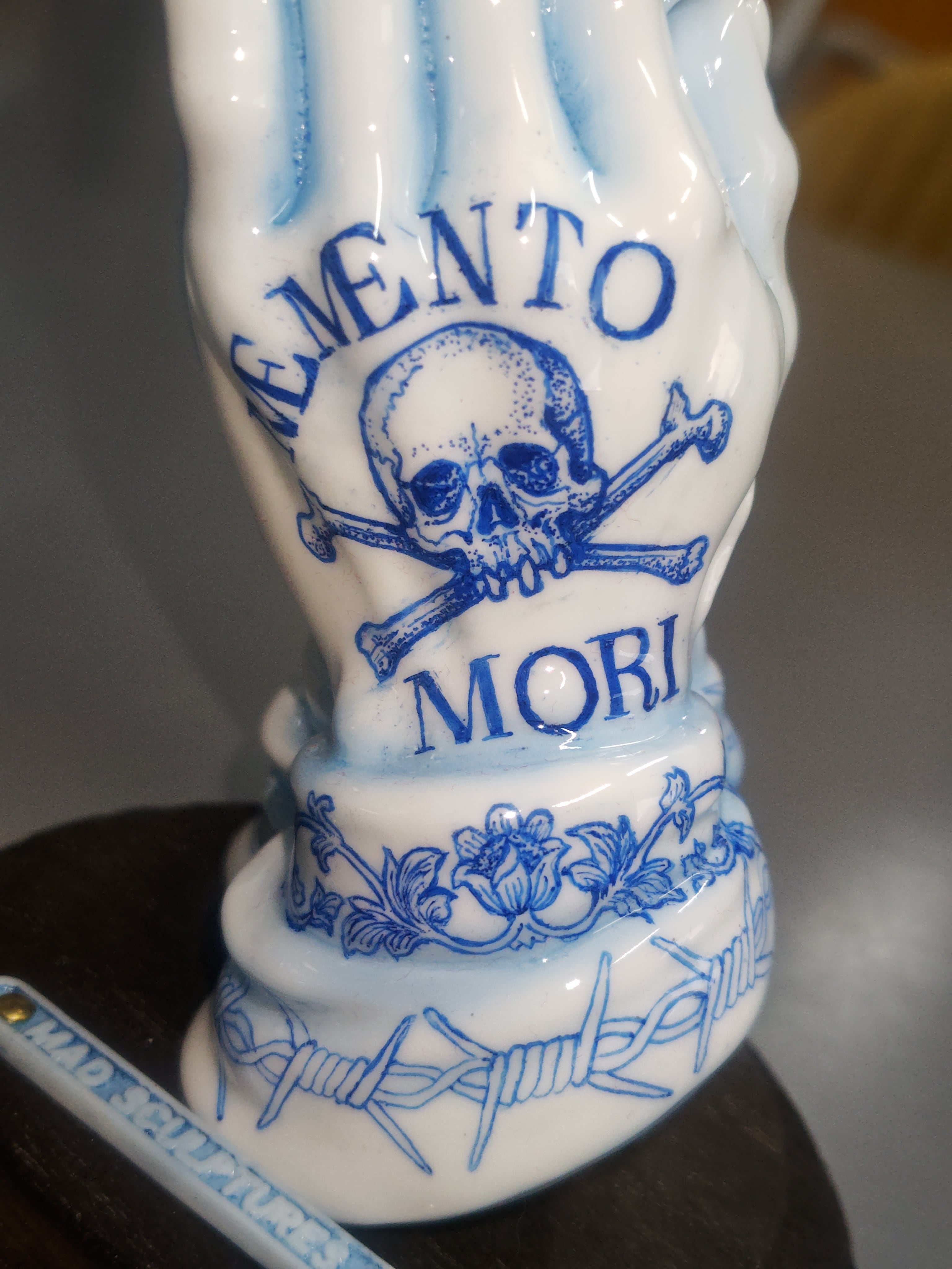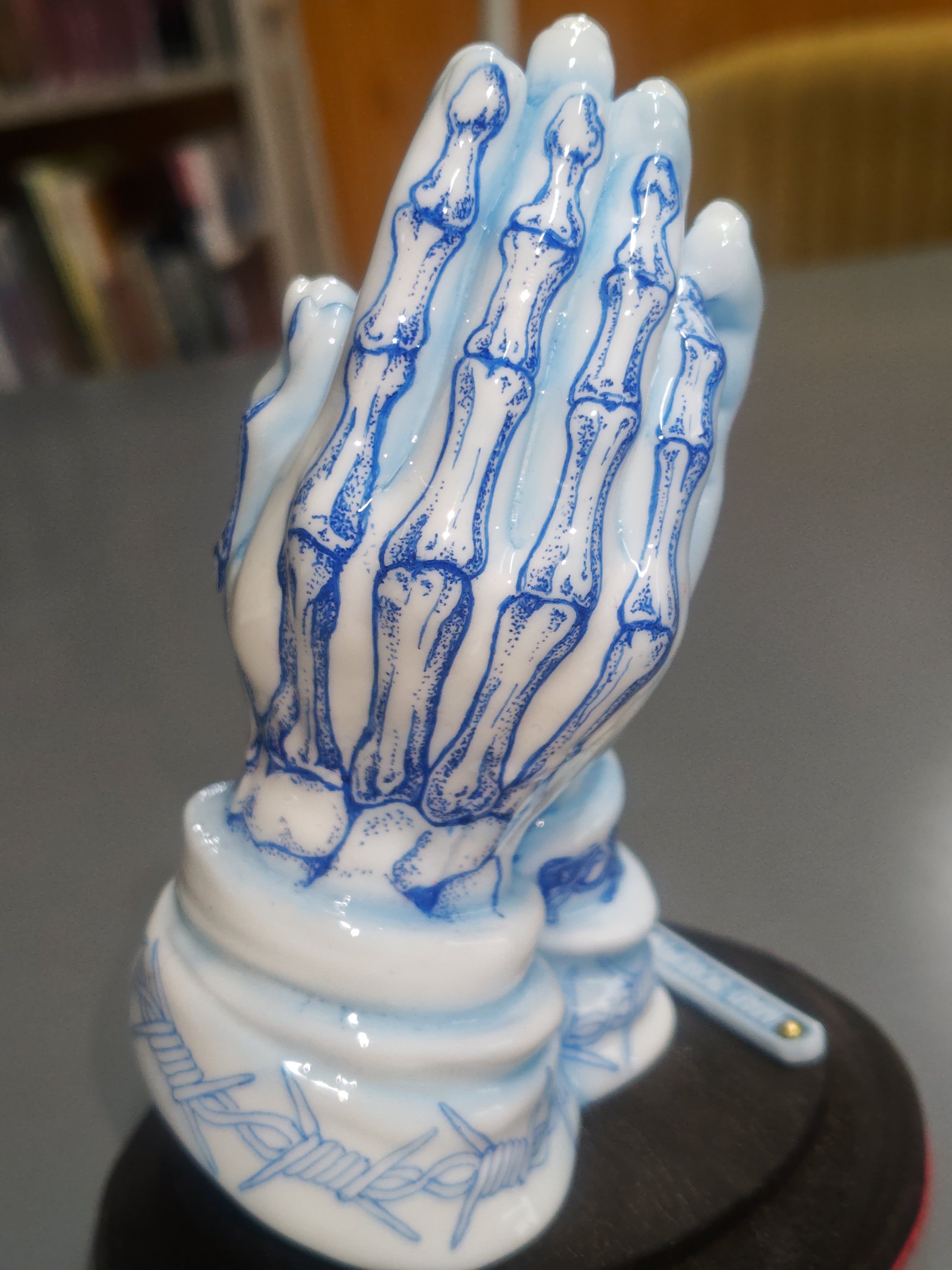 ホワイトのポリウレタン樹脂にペンドローイングを施し、ウレタンクリヤーコーティングで陶器風に仕上げたプレイングハンドです。スカルとクロスのミニチャームとL2サイズの限定イラストが付属します。